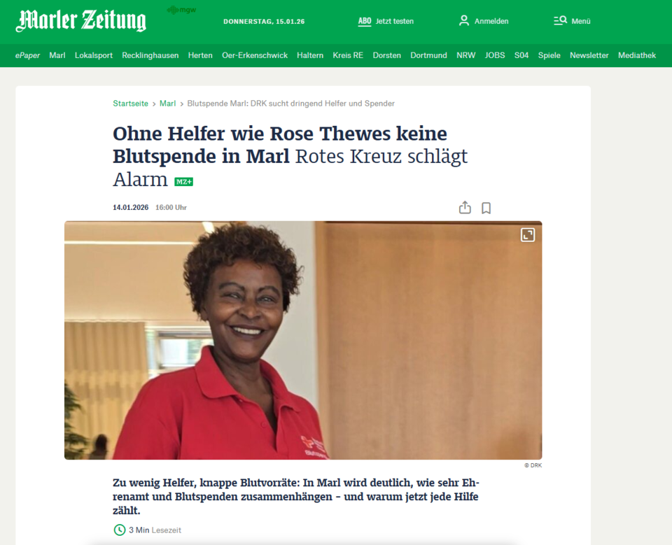 Um den Ablauf unserer Blutspendetermine und die Versorgung mit lebensrettenden Blutkonserven sicherzustellen, ist unsere Blutspende auf Ehrenamtliche sowie Spenderinnen und Spender angewiesen, die sich für eine gute Sache einsetzen. Die Marler Zeitung berichtet heute über dieses Thema.