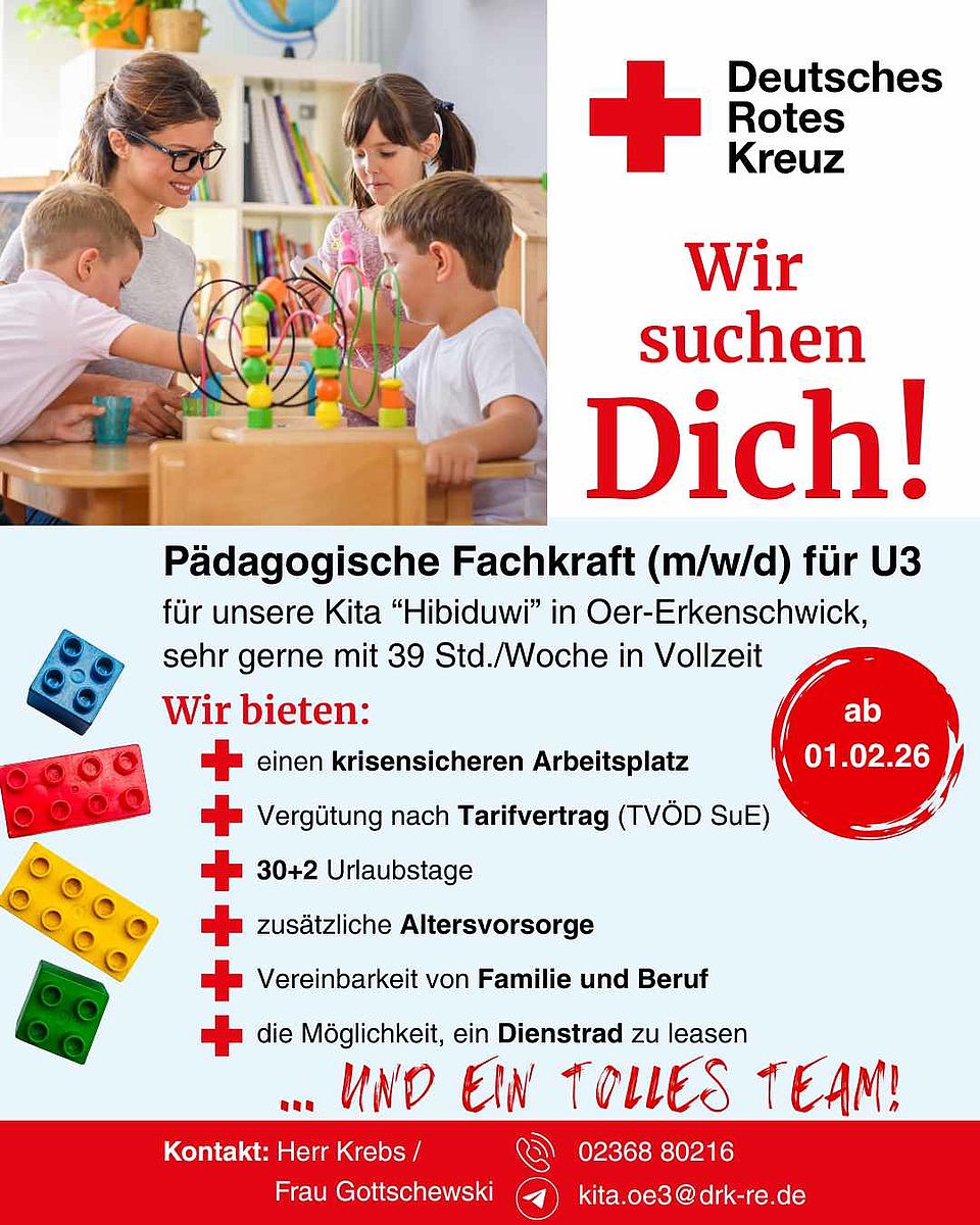 Für unseren DRK-Kindergarten “Hibiduwi” in 45739 Oer-Erkenschwick, Brandenburger Straße 15, suchen wir ab dem 1. Februar 2026 eine Pädagogische Fachkraft (m/w/d) für den U3-Bereich, sehr gerne in Vollzeit mit 39 Std./Woche.