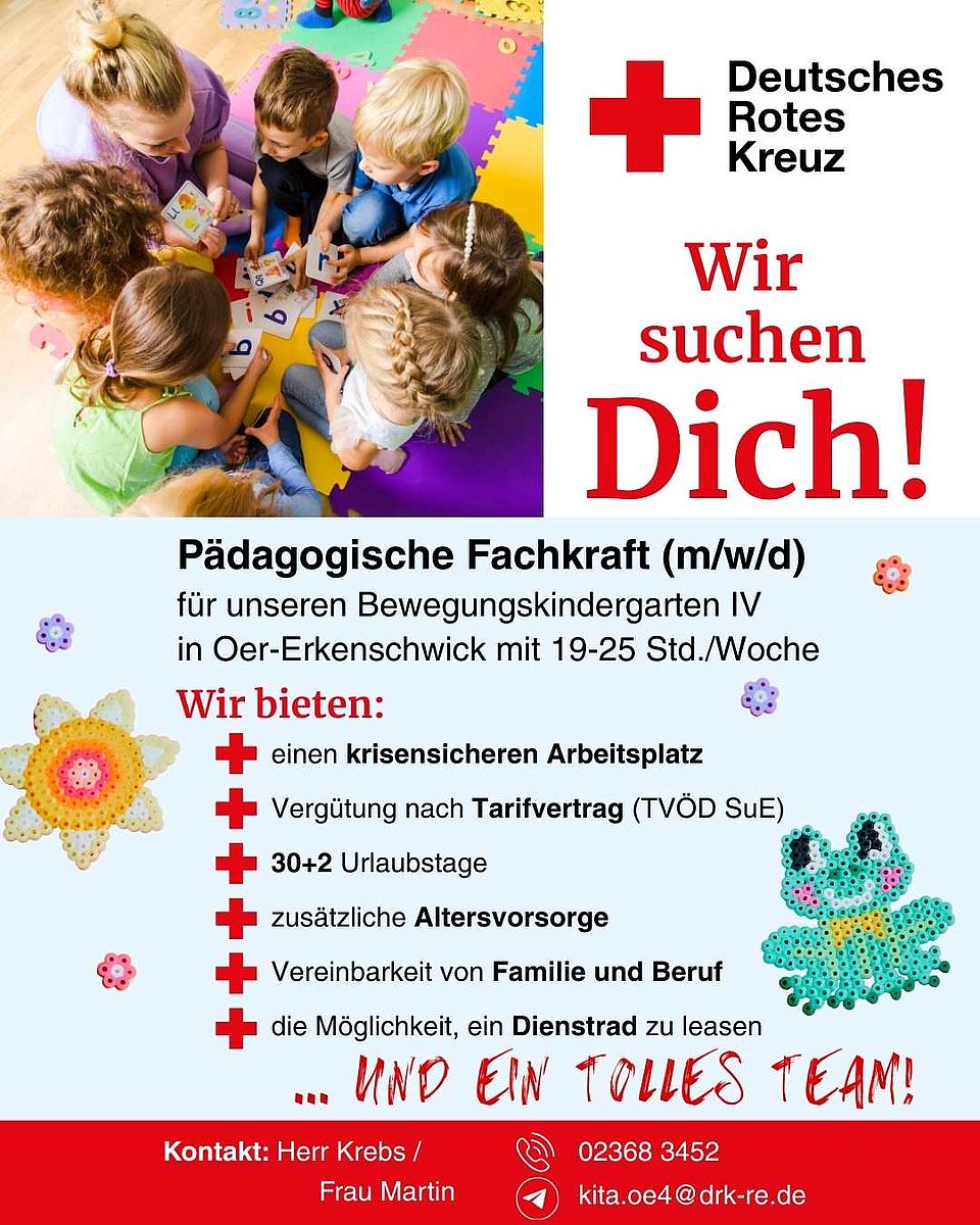 Für unseren DRK-Kindergarten in 45739 Oer-Erkenschwick, Auf dem Kolven 8, suchen wir eine Pädagogische Fachkraft (m/w/d) mit 19-25 Wochenstunden.