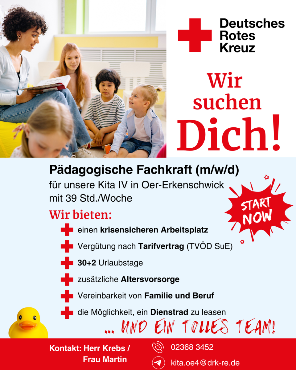 Für unseren DRK-Kindergarten in 45739 Oer-Erkenschwick, Auf dem Kolven 8, suchen wir eine Pädagogische Fachkraft mit 39 Wochenstunden.