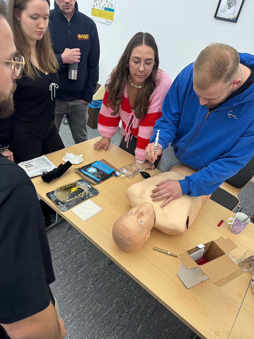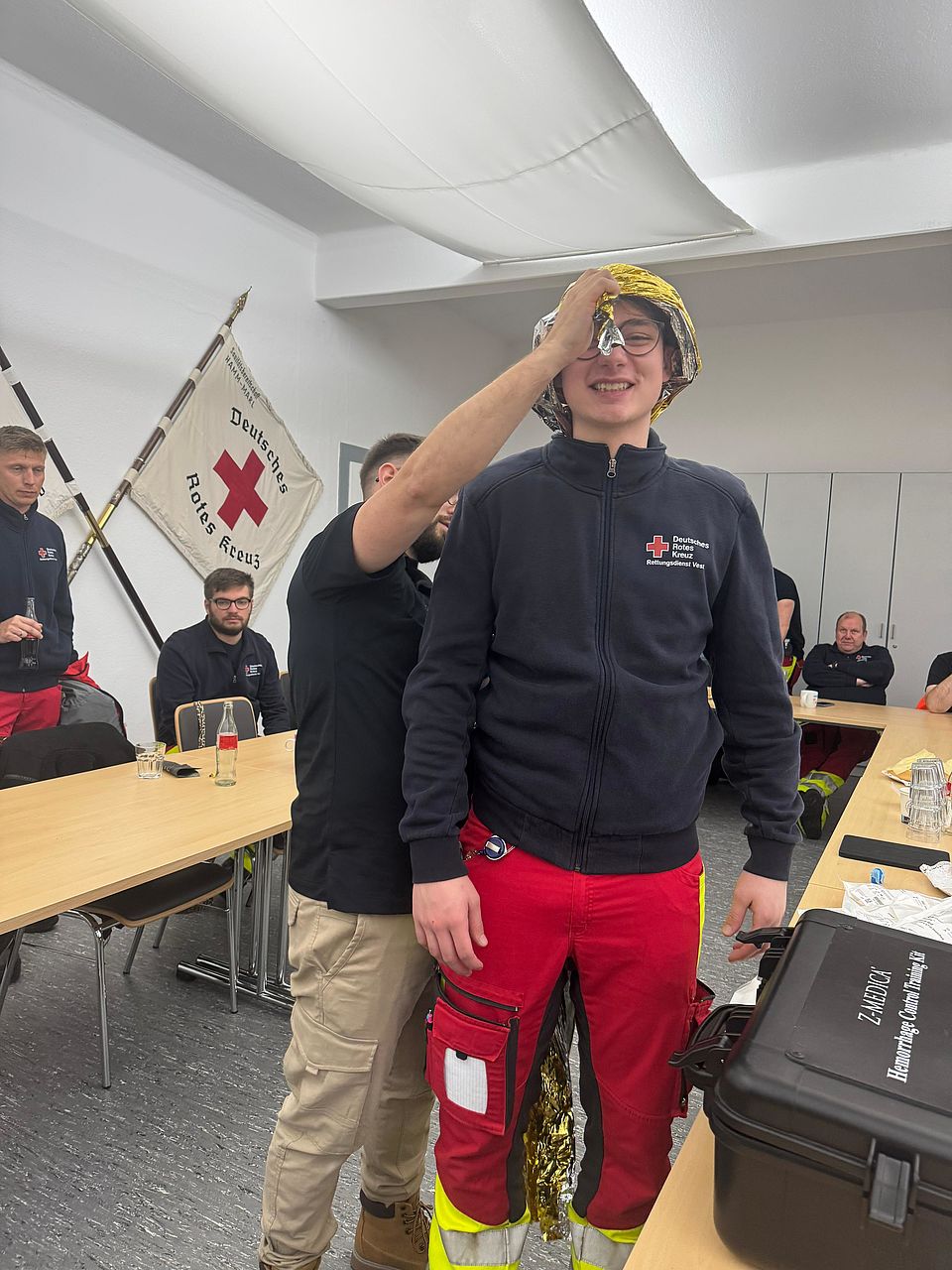 Taktische Medizin - die medizinische Versorgung in Gefahrensituationen, die eine normale Notfallversorgung unmöglich machen - war das Fortbildungsthema bei unserer RD Vest am vergangenen Wochenende. Oberstabsarzt Henning Vaupel gab darin das Wissen, das von Sanitäterinnen und Sanitätern der Bundeswehr gefordert wird, an unser Team weiter. So zeigte er neben Maßnahmen zur Thorax-Entlastung und Methoden des Wound Packing die variable Anwendbarkeit von Mitteln des Rettungsdienstes, indem etwa eine Rettungsdecke behelfsmäßig unter anderem zur Beckenschlinge oder zum Verband umfunktioniert wurde.