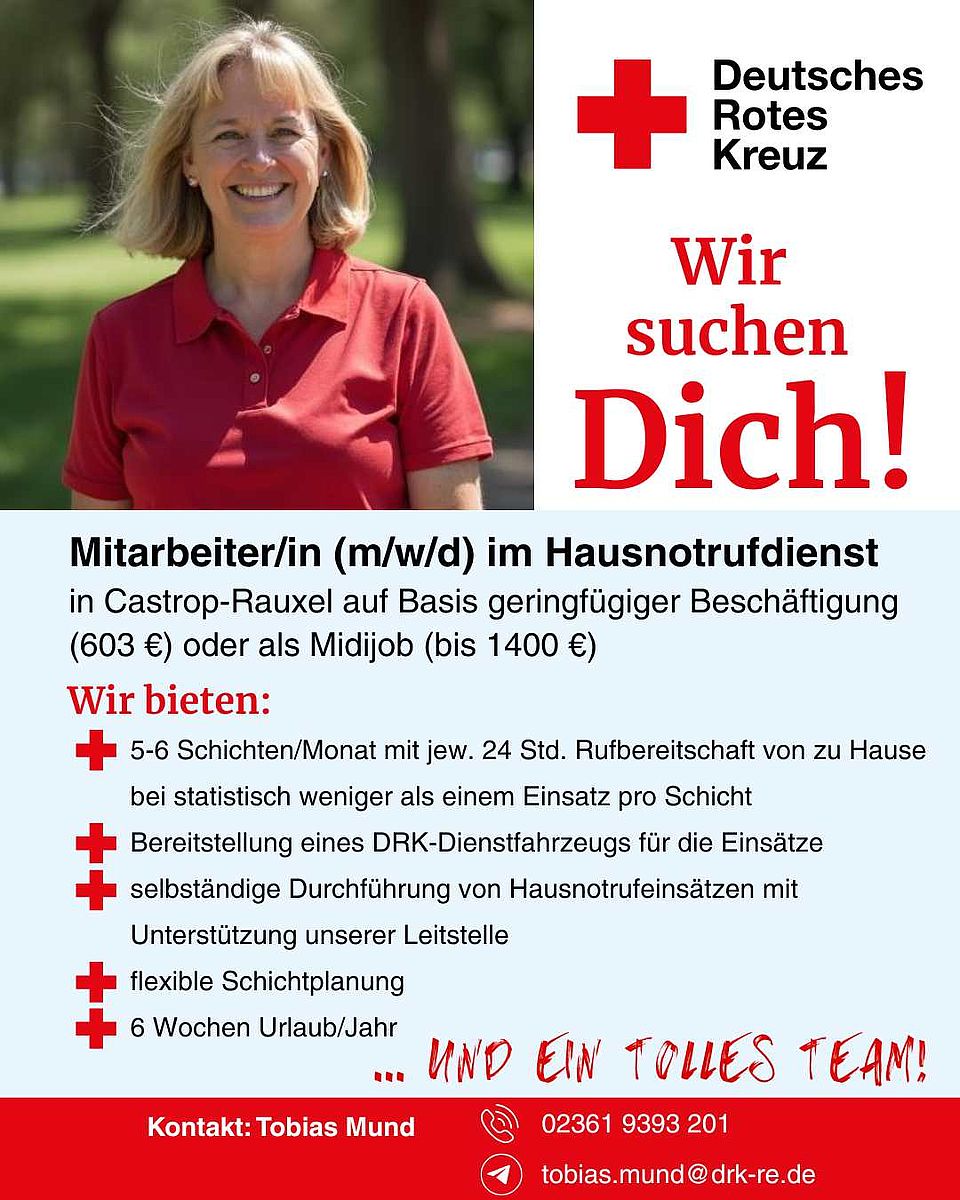 Mitarbeiter/in im Hausnotruf-Einsatzdienst (m/w/d) in Castrop-Rauxel auf Basis geringfügiger Beschäftigung (603,- €) oder als Midijob (bis zu 1400 €)